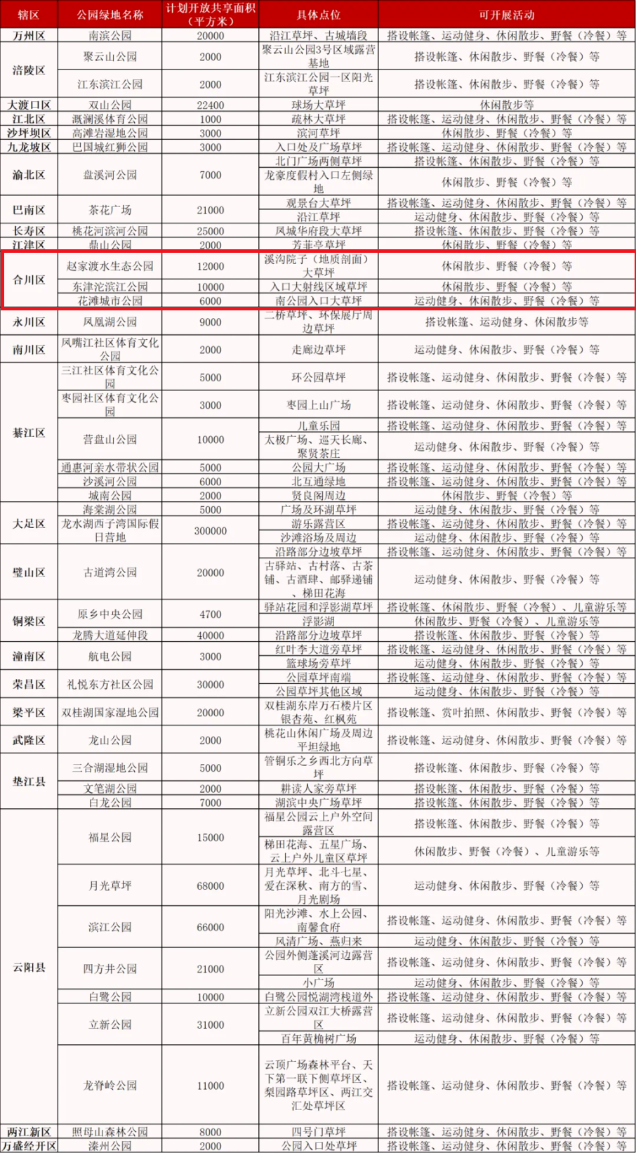 随后,重庆市城市管理局积极响应,制定了《城市公园绿地开放共享试点工作实施方案》,4月公布首批35个公园已开展开放共享试点,供市民游客开展各项亲近自然的活动。