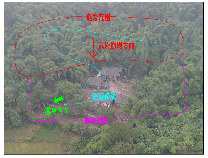 ▲合川区涞滩镇水寺村福柳坪寨子危岩威胁范围示意图