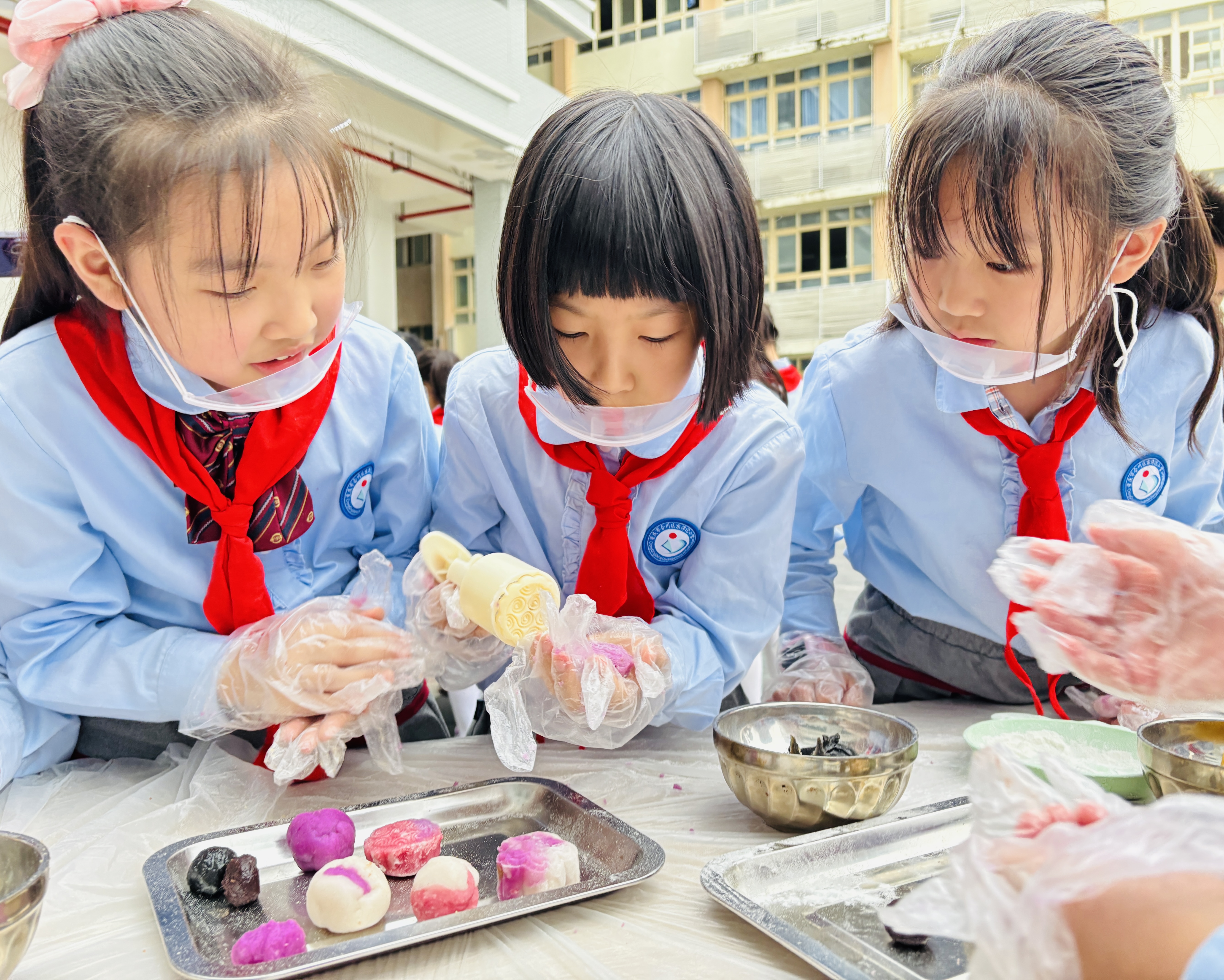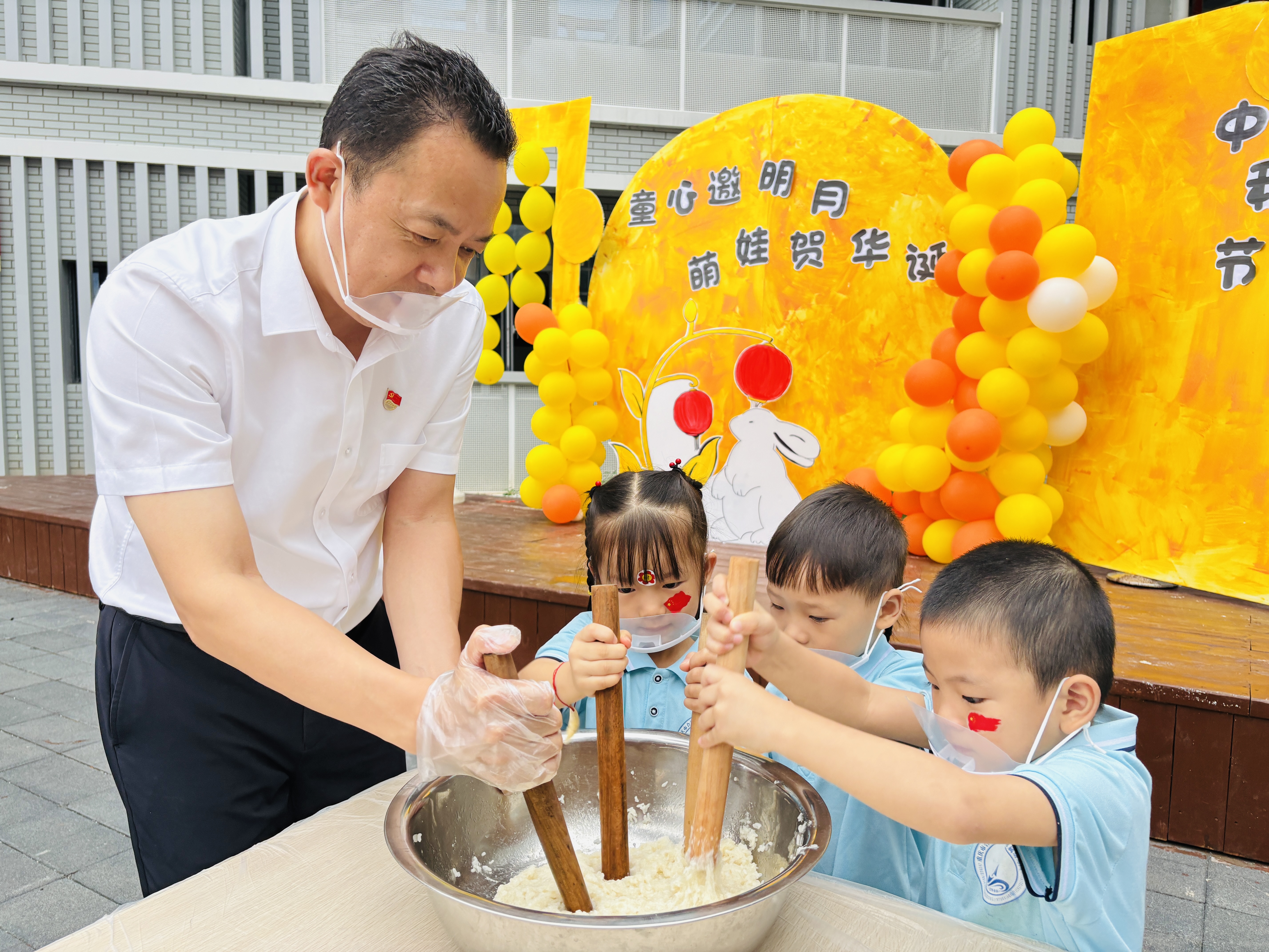 最热闹的当属手工环节,孩子们在老师的指导下揉面团、包馅料,制作出形态各异的月饼;另一边,打糍粑的石臼前也围满了人,孩子们轮流上阵,在捶打与互动中感受传统美食的制作乐趣。