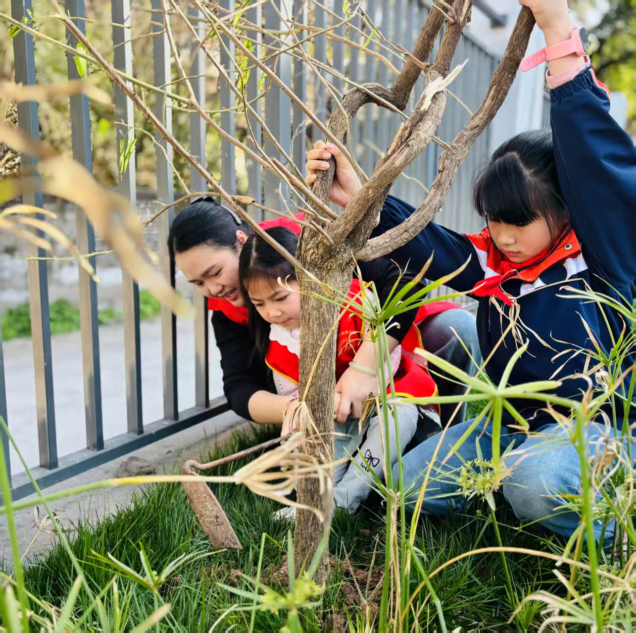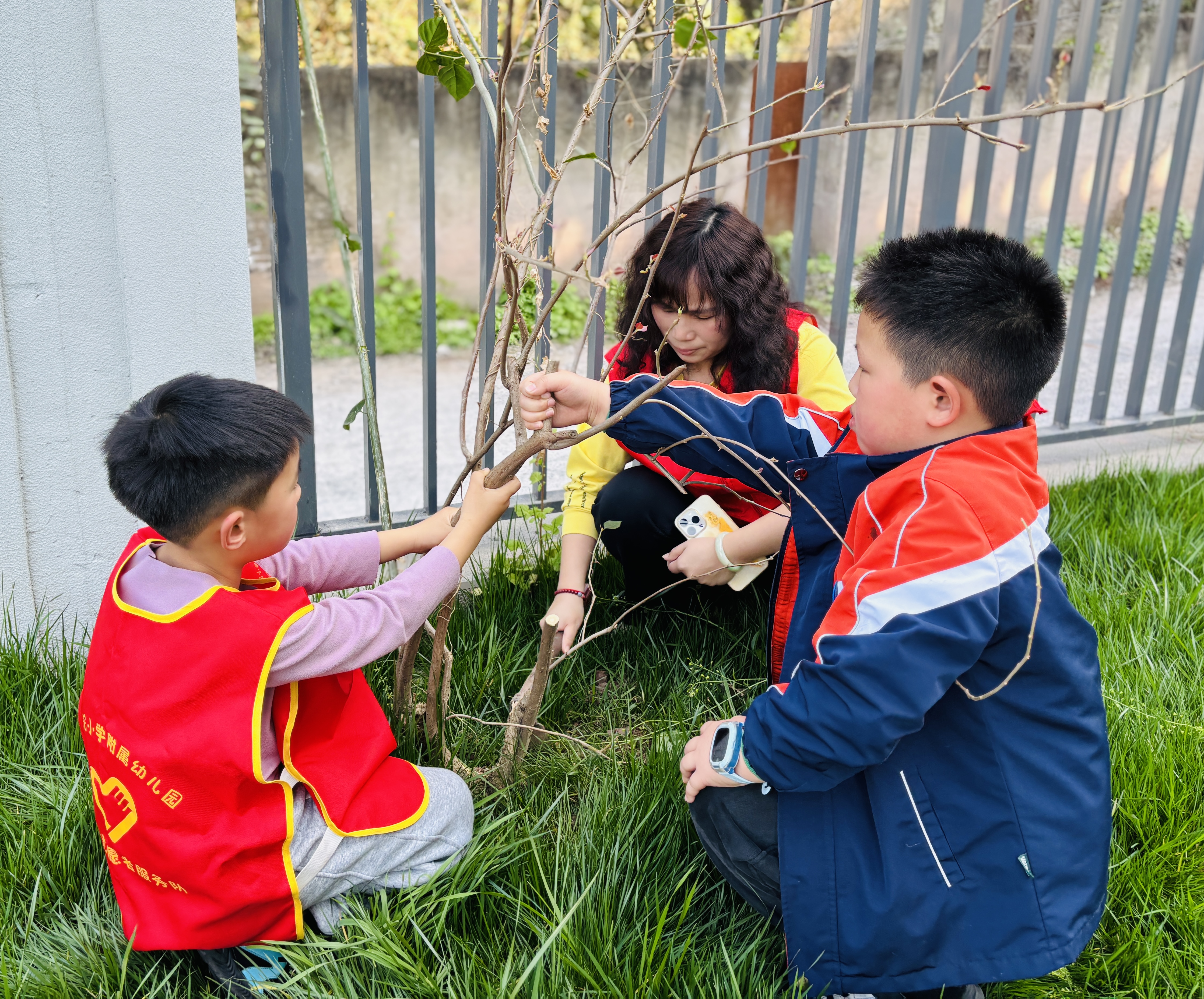 活动现场,孩子们化身“小小护绿使者”,在老师的指导下,全程参与种植。从手持小铁锹挖坑,到小心翼翼地将三角梅、蔷薇、腊梅花苗扶正、培土、浇水,每个步骤都做得一丝不苟。幼儿园的小朋友与高年级学生互帮互助,暖意融融,忙碌的身影与欢声笑语交织。成为校园里一道动人的风景。