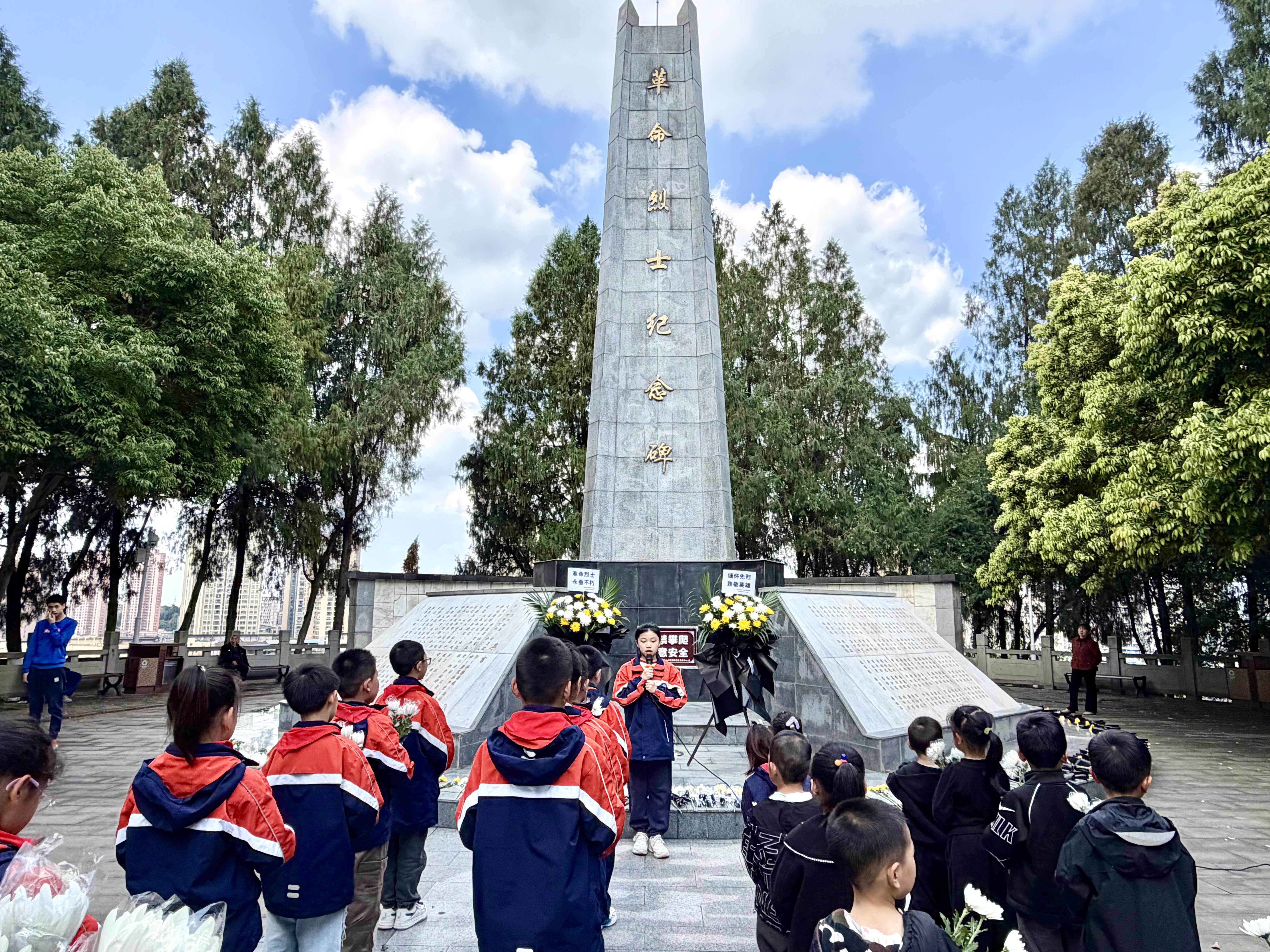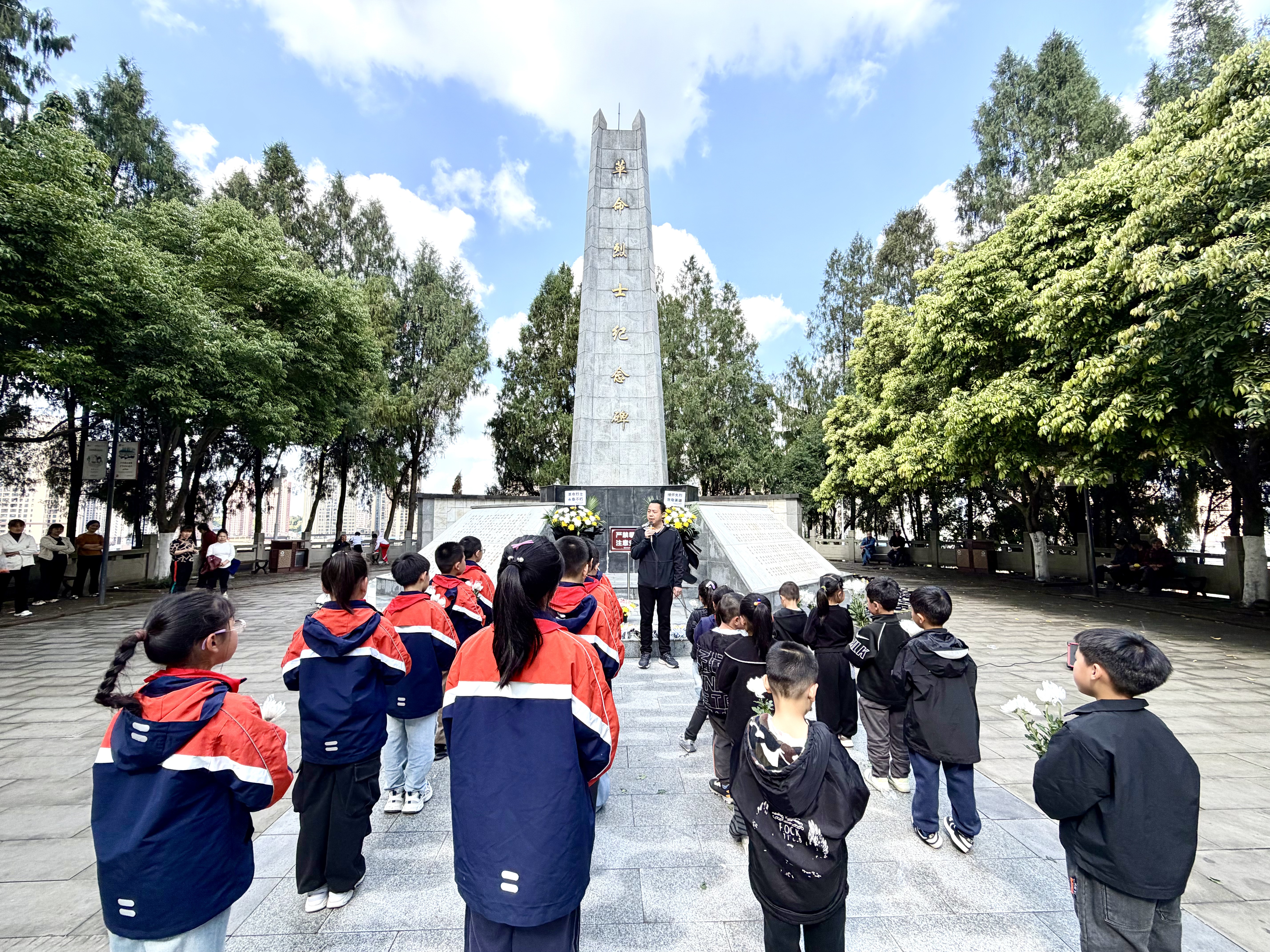 活动中,学校负责人与学生代表先后发言,共同呼吁全体师生铭记先烈遗志,将爱国情怀与时代使命融入日常学习与生活之中。紧接着,师生们缓步上前,向革命烈士纪念碑敬献花圈与鲜花。一束束鲜花,寄托着对英雄的无尽怀念与崇高敬意。活动最后,全体师生面向纪念碑庄严宣誓,铿锵有力的誓言在纪念碑前回荡,表达了继承先烈精神、奋发向未来的坚定决心。